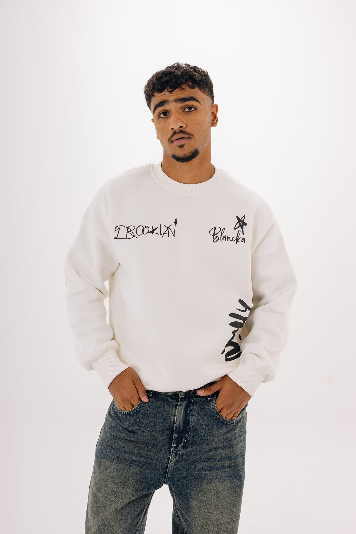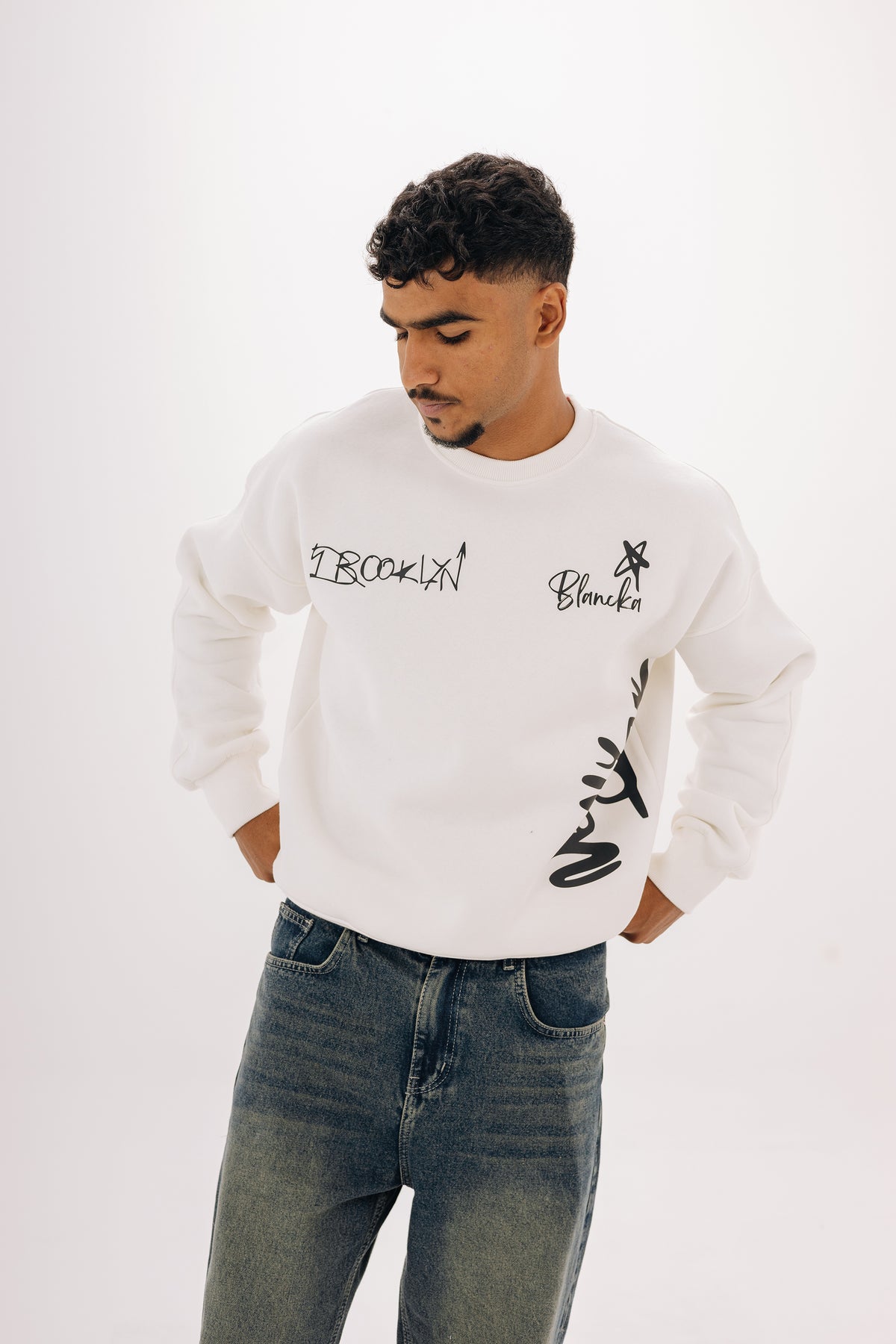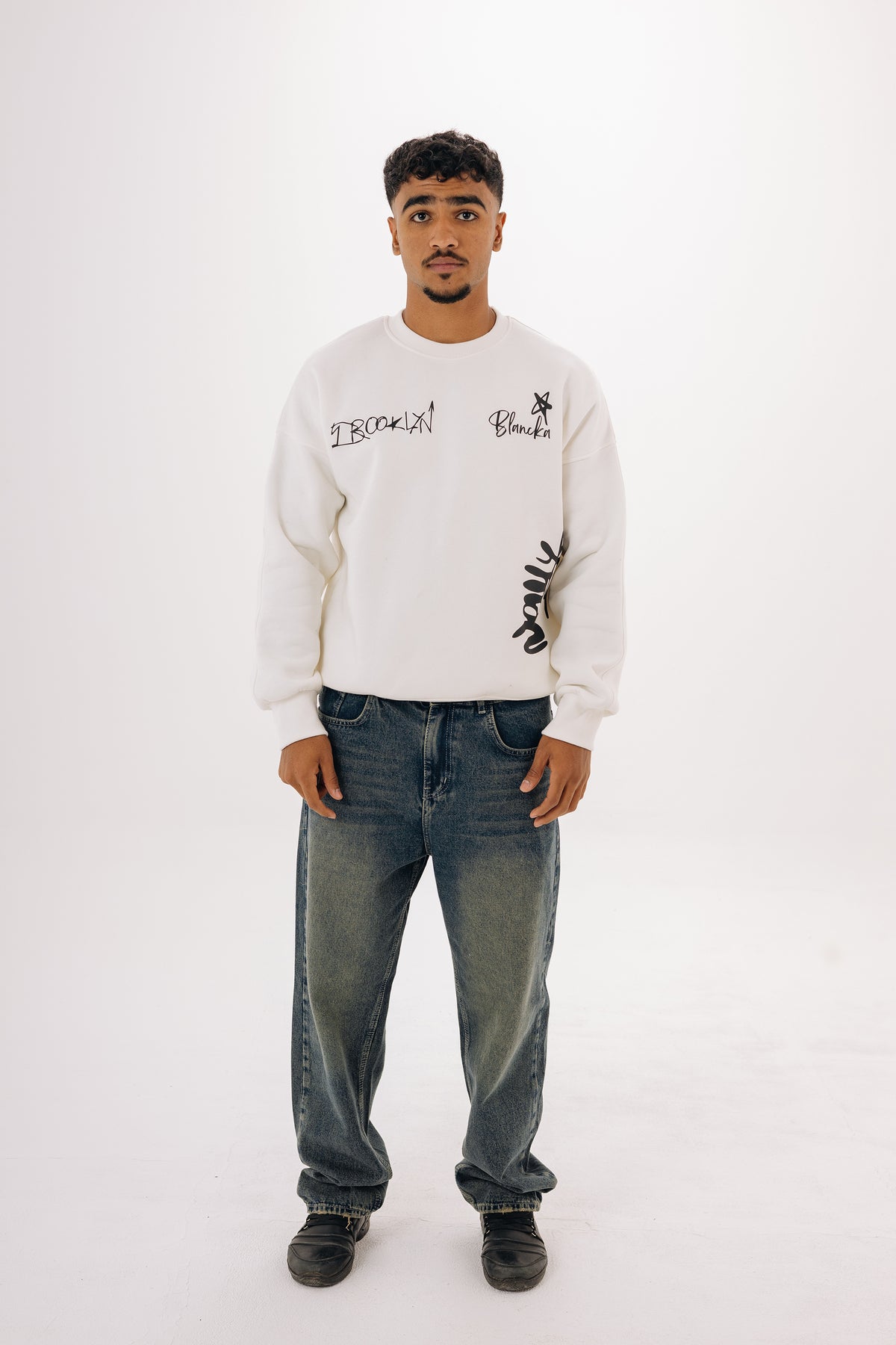 سويتشيرت Boxy Brooklyn Crewneck — تصميم Unisex بخامة تقيلة وطباعة جرافيتي مميزة بالأسود.