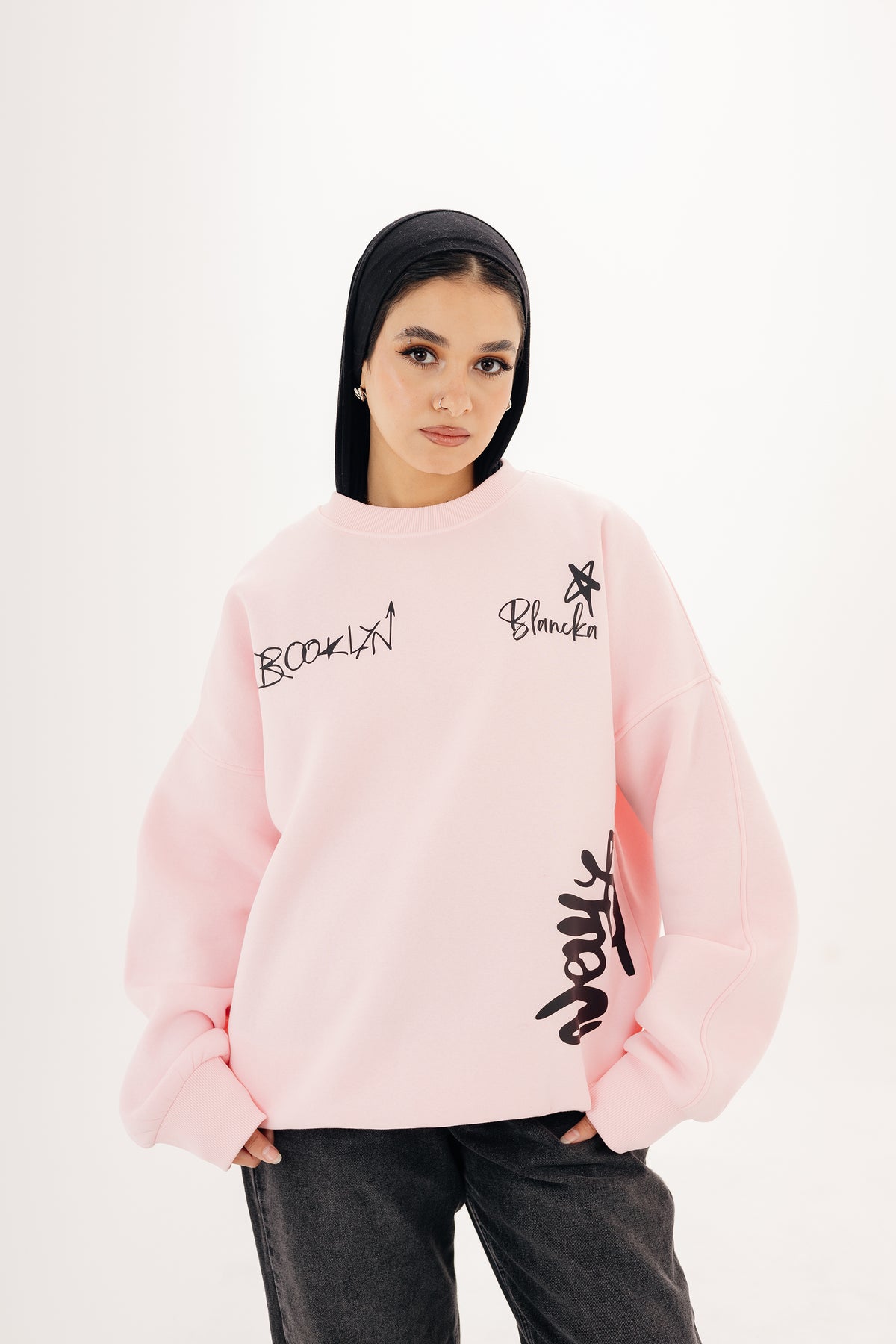 سويتشيرت Boxy Brooklyn Crewneck — تصميم Unisex بخامة تقيلة وطباعة جرافيتي مميزة.