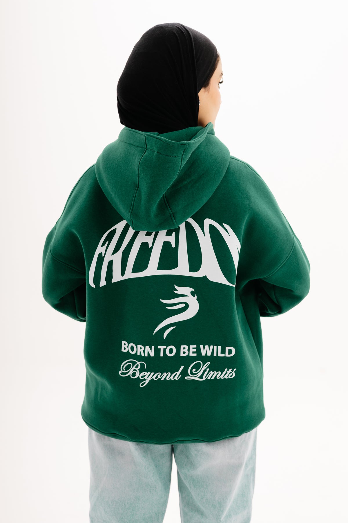 Unisex olive hoodie with Beyond Limits DTF print by BLANCKA — front and back view on model