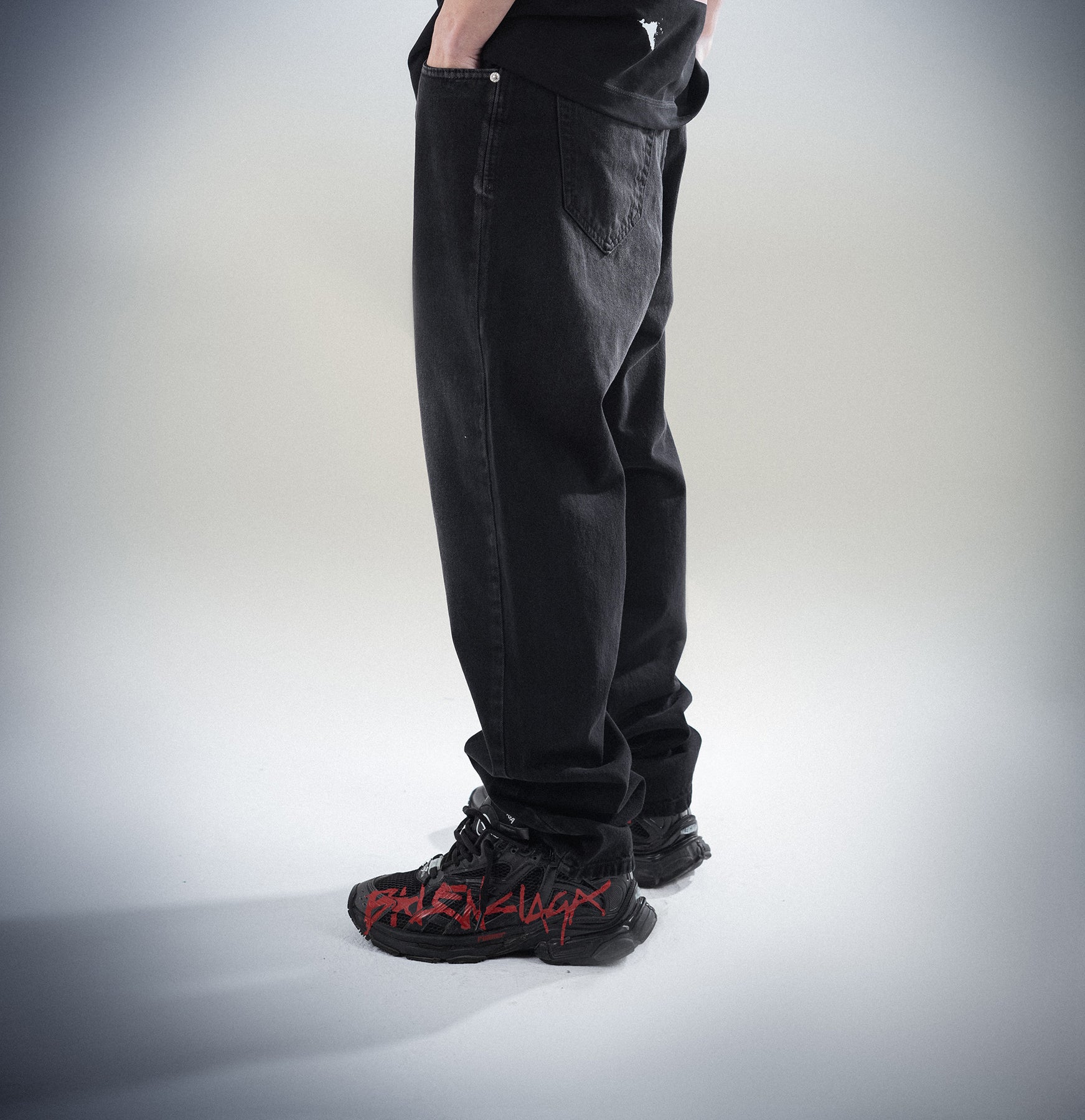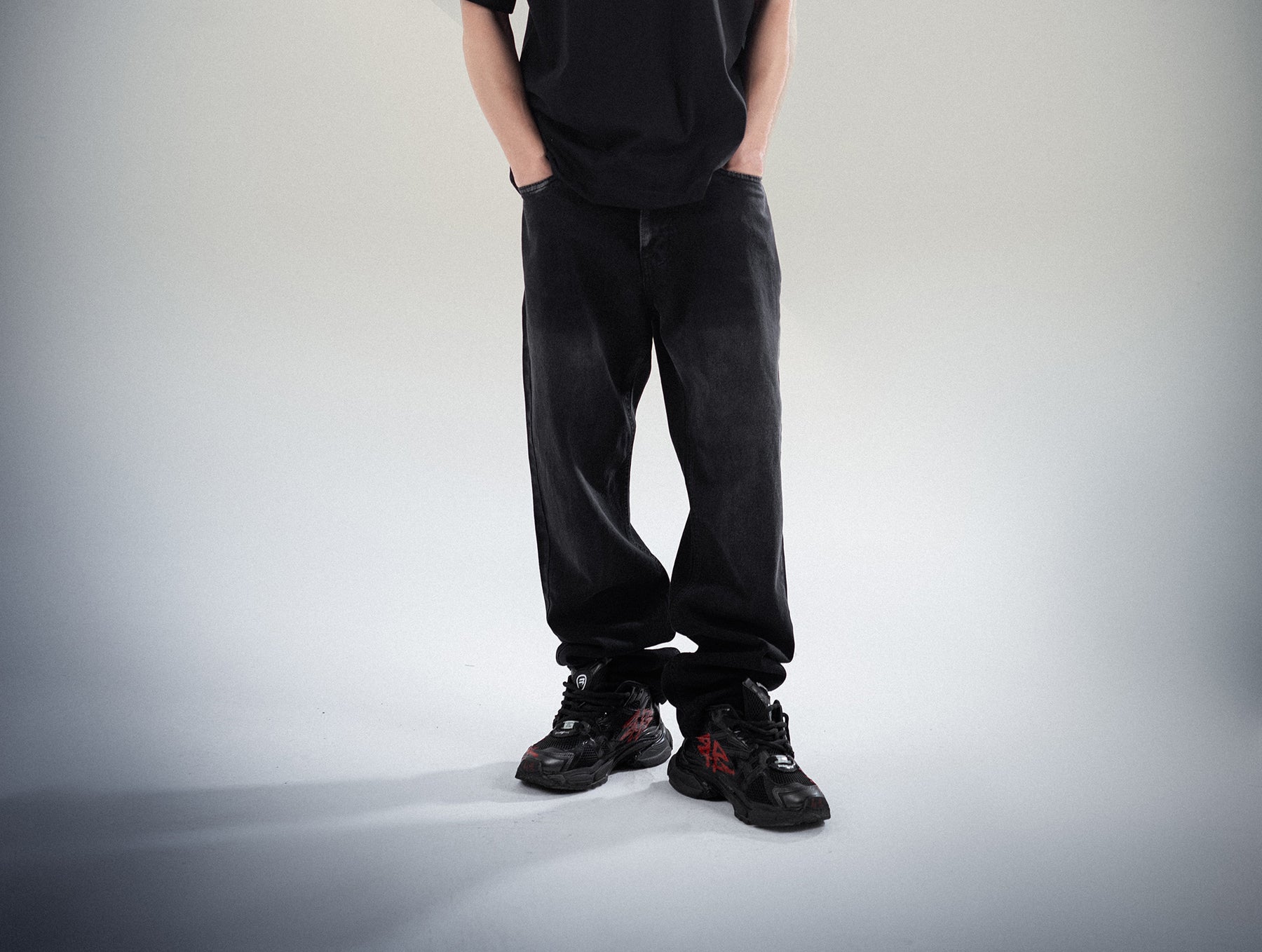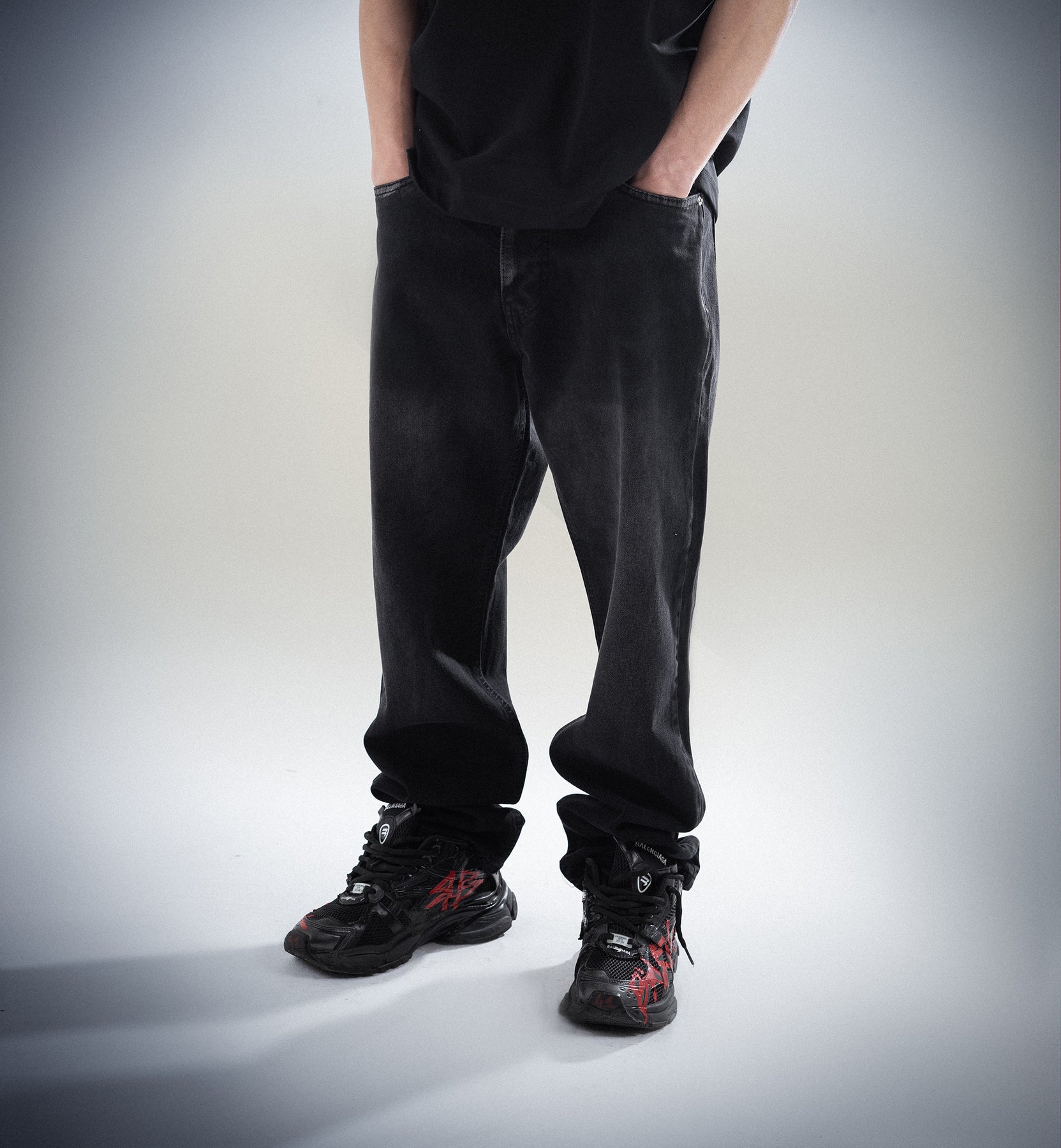 A black washed denim with a relaxed wide fit and subtle fading for a clean vintage look. Designed for daily streetwear with a loose full-length silhouette.
