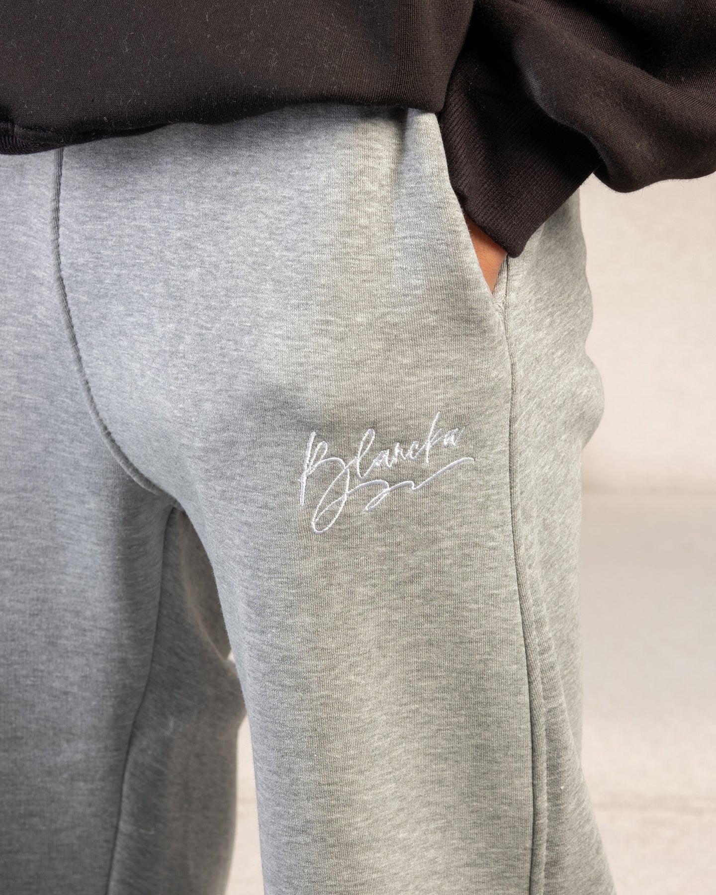 Wide-leg sweatpants بخامة تقيلة وملمس ناعم. فيت واسع، وسط مطاطي، جيوب جانبية عميقة، وتطريز BLANCKA. اللون Gray سهل يتنسّق مع أي outfit.